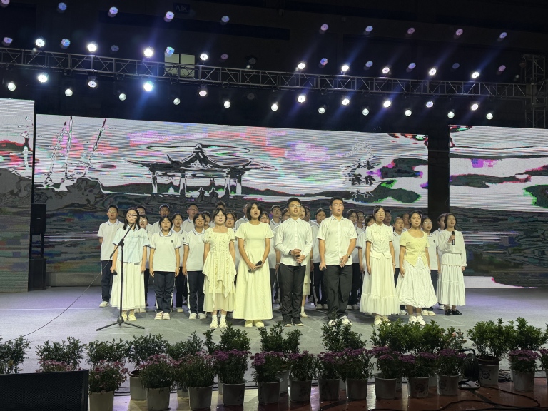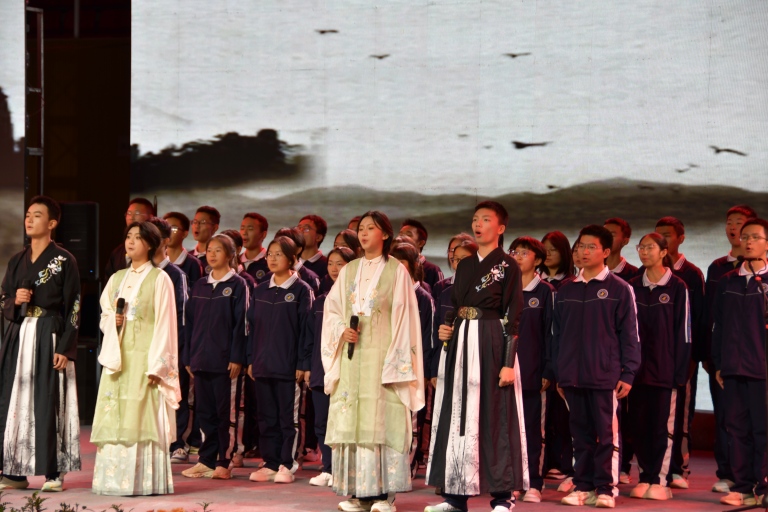 当晚会的热烈渐趋深沉,高一语文组教师代表的集体朗诵为这场声音的盛宴画上圆满句点。老师们庄重而温润的声音,引领全场穿越三千年的岁月,回到华夏诗歌的清澈源头。《诗经》选段的古朴章句与真挚情感,让整个会场沉浸在肃穆而美好的氛围中。
