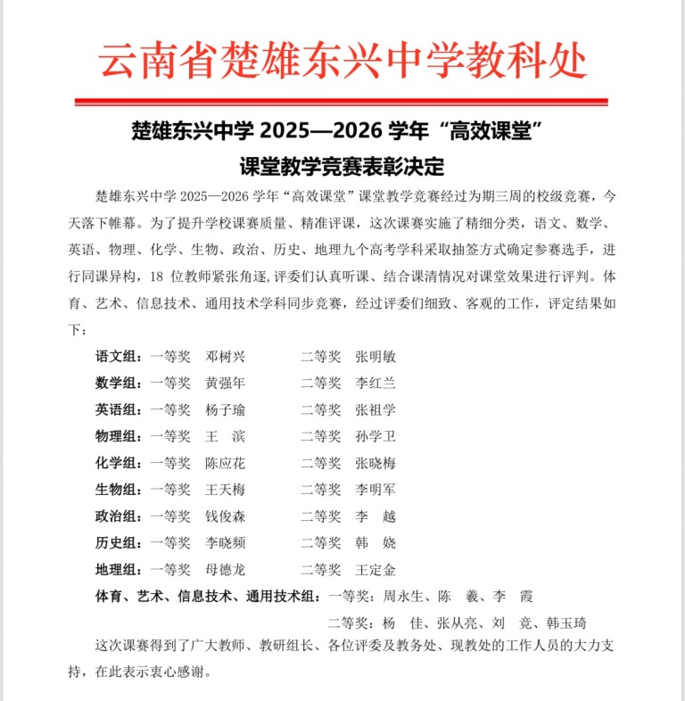 经过为期三周的激烈角逐和评委们公平公正的评判,本次课堂竞赛表彰决定如下: