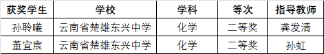 化学科目,孙聆曦同学、董宜宸同学荣获二等奖!龚发清老师、孙虹老师荣获指导教师奖!
